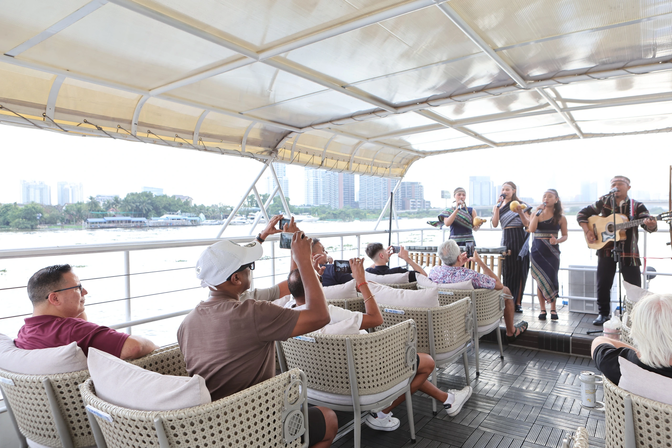 Không gian tầng 2 buýt sông Saigon WaterGO trở thành “sân khấu nổi” trên sông Sài Gòn, du khách vừa thư giãn ngắm cảnh vừa thưởng thức âm nhạc dân gian