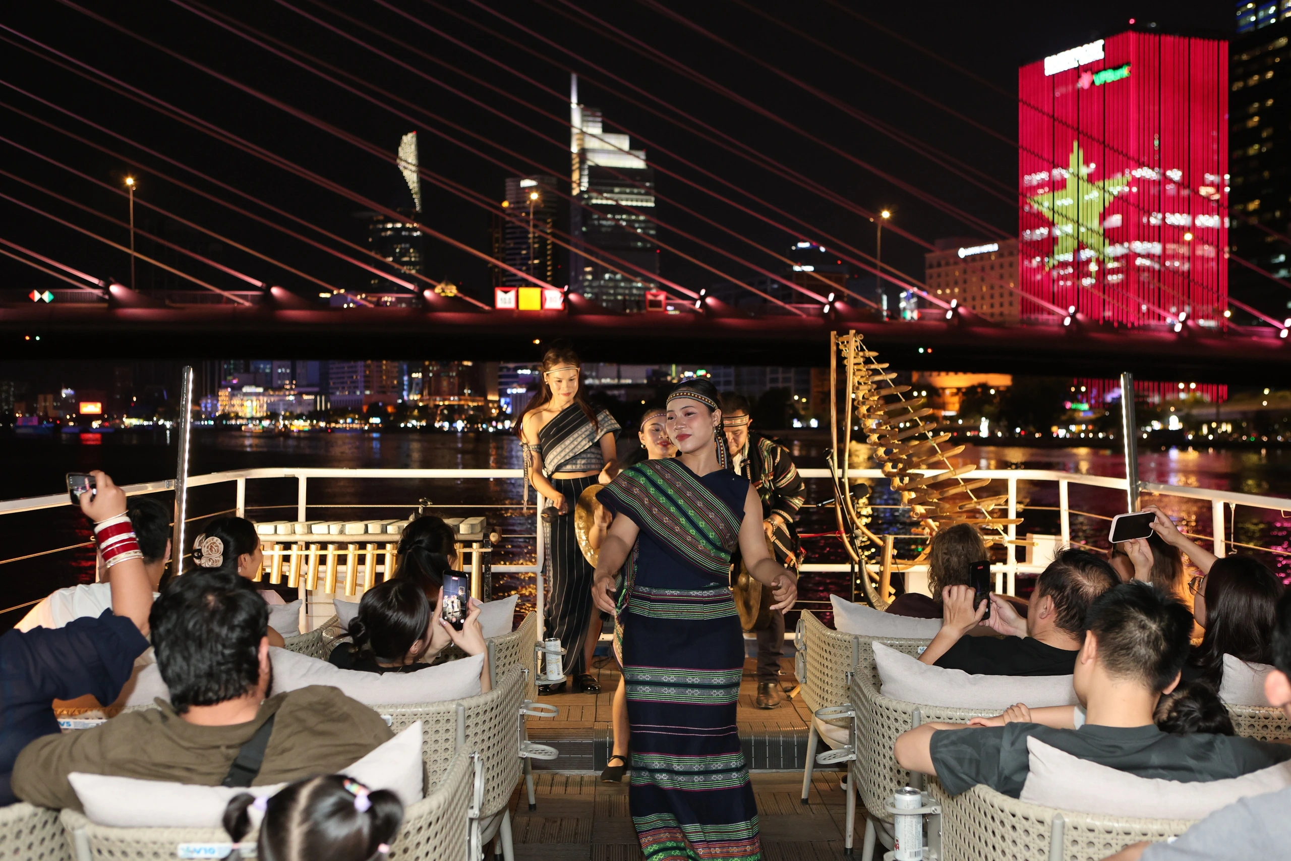 Chiều 4.2, tại bến buýt sông Bạch Đằng, nhiều du khách quốc tế và Việt Nam tỏ ra thích thú khi vừa bước chân xuống bến đã được chào đón bằng màn trình diễn cồng chiêng Tây nguyên rộn ràng. Không gian Tết Việt được tái hiện ngay từ điểm khởi hành, mở đầu cho một hải trình mang đậm dấu ấn văn hóa bản địa giữa lòng đô thị.